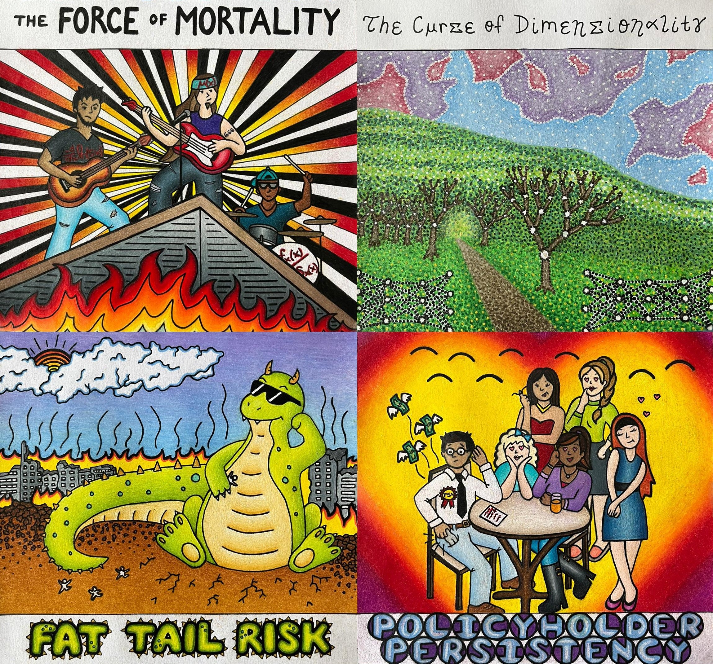 Each picture within this piece depicts a different aspect of actuarial science. Pictures show the progression of the actuarial profession: constructing life-tables, assessing impacts of extreme tail events, understanding policyholder behaviour, and applying predictive modelling techniques. These components and their interactions will continue to be a key part of actuarial future. |