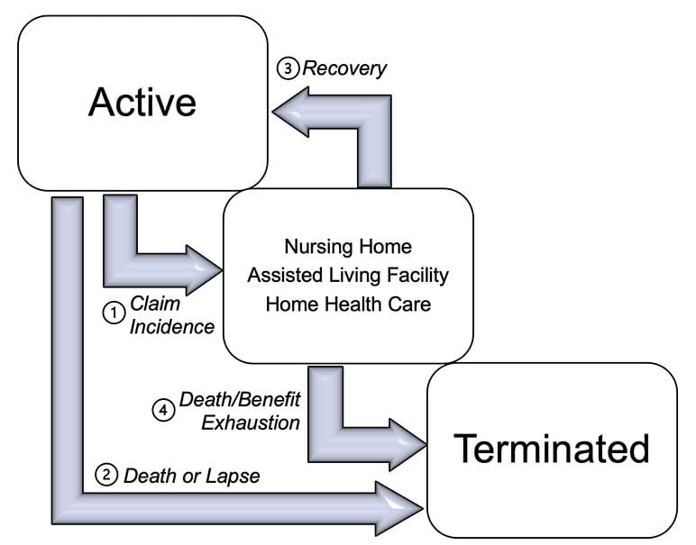 There are multiple states to consider when modeling hybrid products. Figure 1 below demonstrates these states and their associated transitions. For example, at issue, a policyholder begins in the active state. This policyholder may then either, (1) move to the disabled state (on-claim), or (2) terminate their policy due to death or lapse. If the policyholder moves to the disabled state, the claimant may either, (3) recover back to the active state, or (4) terminate due to death or benefit exhaustion.