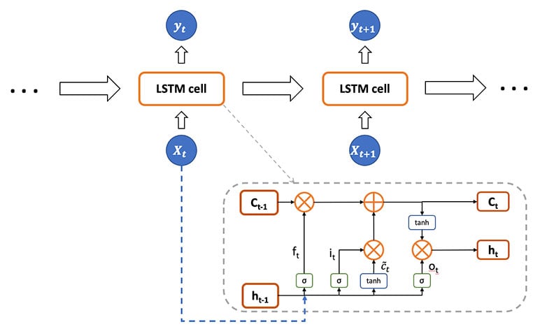 An LSTM cell is composed of an input gate, an output gate and a forget gate, controlling the income and output flow of information in the cell. Mathematically, denote k as the hyperparameter of the dimension of states: