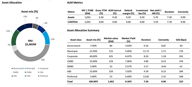 Exhibit 3 below illustrates XYZ’s current ALM report. It includes standard ALM metrics such as asset mix, market values, gross and net yields, interest rate duration and convexity, and spread.