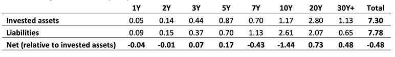In recent years, the interest rate curve has been inverted and there is uncertainty around the future shape of the curve. XYZ incorporated key rate duration (KRD) to their ALM report to assess the sensitivity of assets and liabilities to individual interest rate tenors. This is important because there has been significant deviation of rate changes by tenors and future interest rate curve changes may not be parallel either. This allows XYZ to gain a more detailed understanding of duration mis-matches that may exist. (see Exhibit 5)